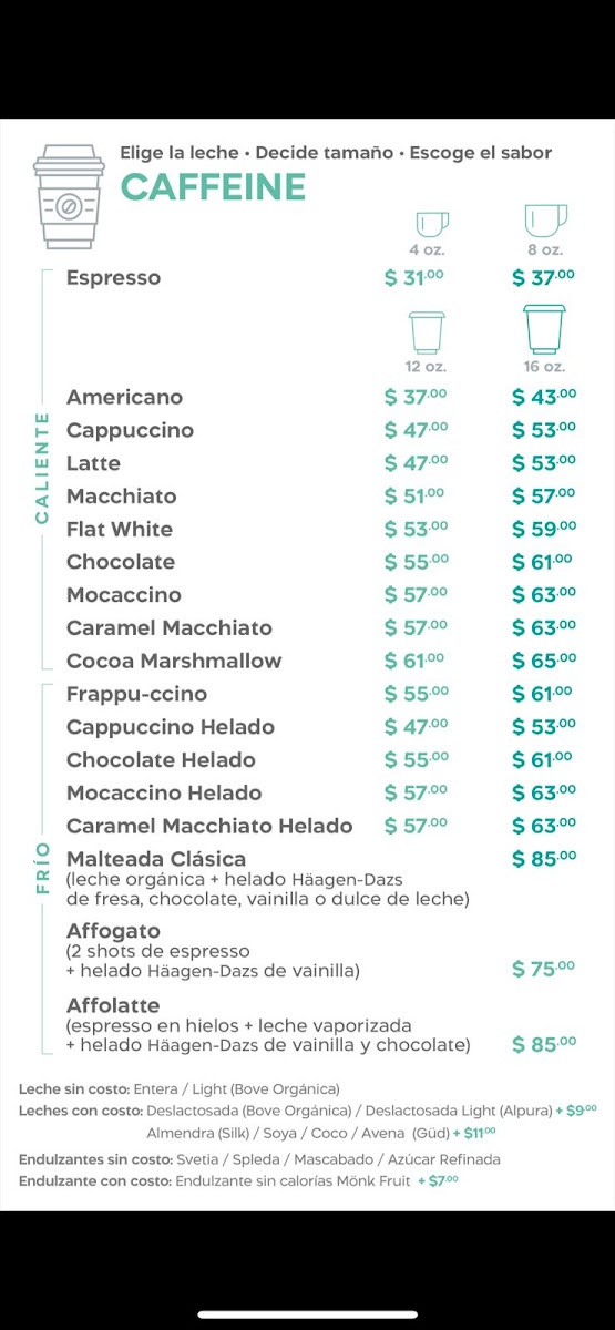 Leche a elegir vaporizada en dos terceras partes, una de café, tamaño y endulzante a elegir.
